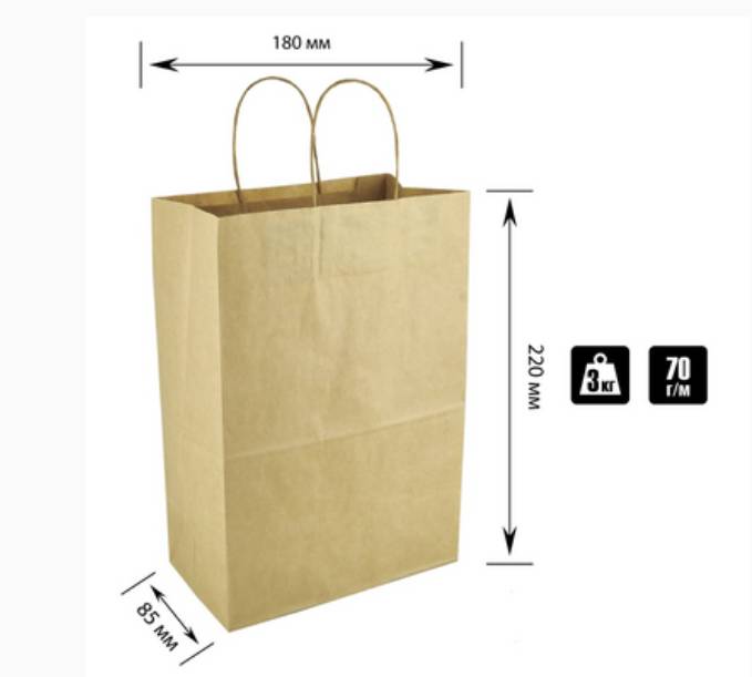 Паперовий пакет крафт з ручками бурий 180х85х220 мм для зернової кави та кав'ярень. 1 уп-10шт